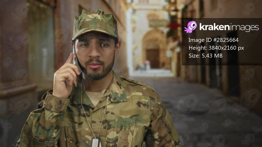 Man wearing camouflage uniform speaks on smartphone on narrow street lined with historic stone archways; duty.