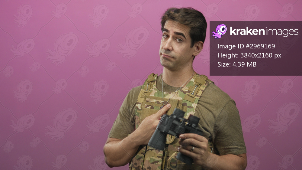 Man wearing camouflage vest and dogtags points finger to chest while holding binoculars in studio; resignation doubt reflection.