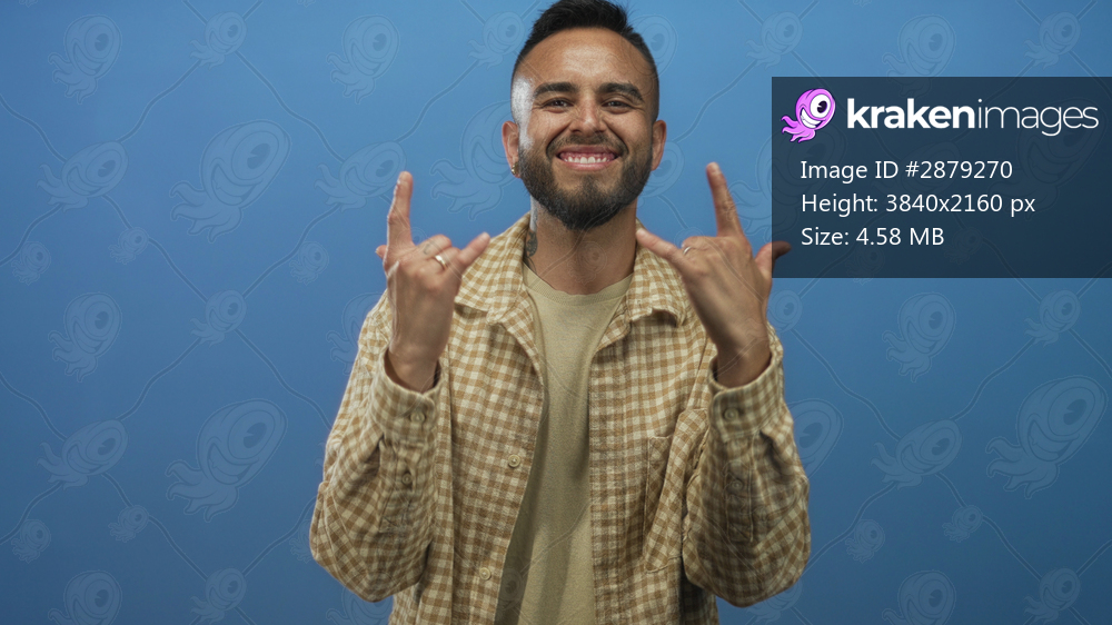Man wearing checked shirt smiling and showing rock horns with both hands in blue studio; joy casual confidence.