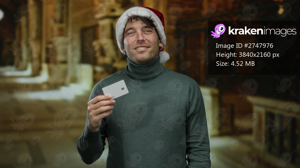 Man wearing christmas hat holds and points at credit card in museum gallery showing excitement and festive mood.