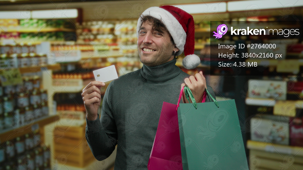 Man wearing christmas hat holds shopping bags and credit card in grocery store during holiday season, smiling and cheerful amid festive shopping environment. - Kraken Images