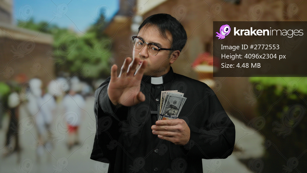 Man wearing clerical attire stands outdoors examining currency in a bustling urban street with blurred pedestrians and historic architecture in the background. - Kraken Images