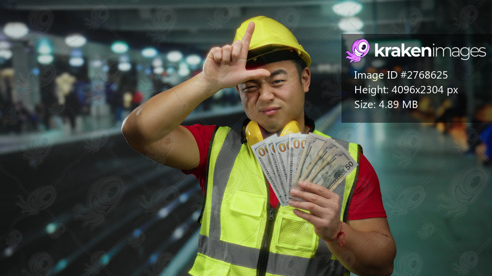 Man wearing construction vest holding us dollars at railway station making loser gesture showcases industrial and finance themes in public transport setting. - Kraken Images