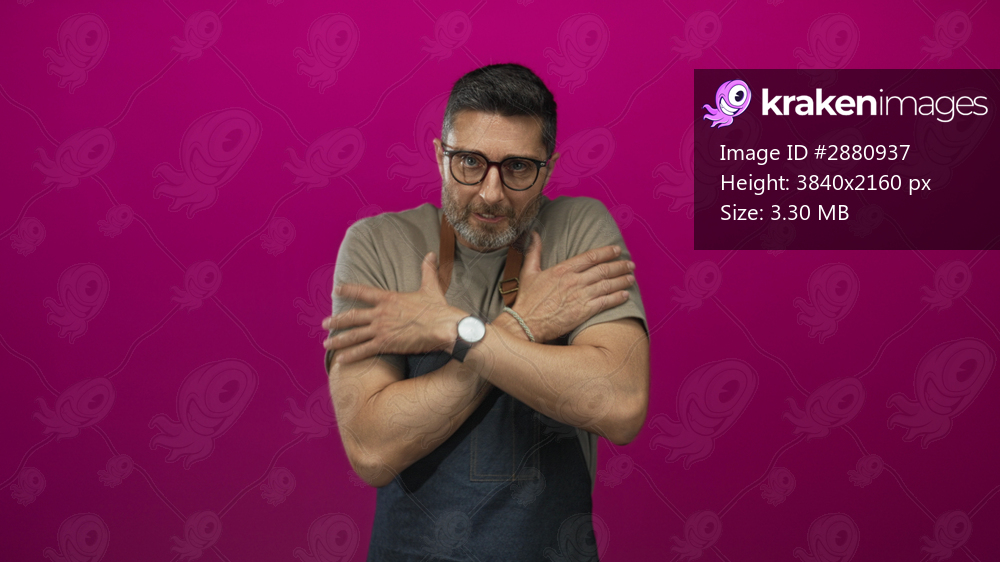 Man wearing denim apron and glasses with crossed arms hugging chest in magenta studio; comfort reflection.
