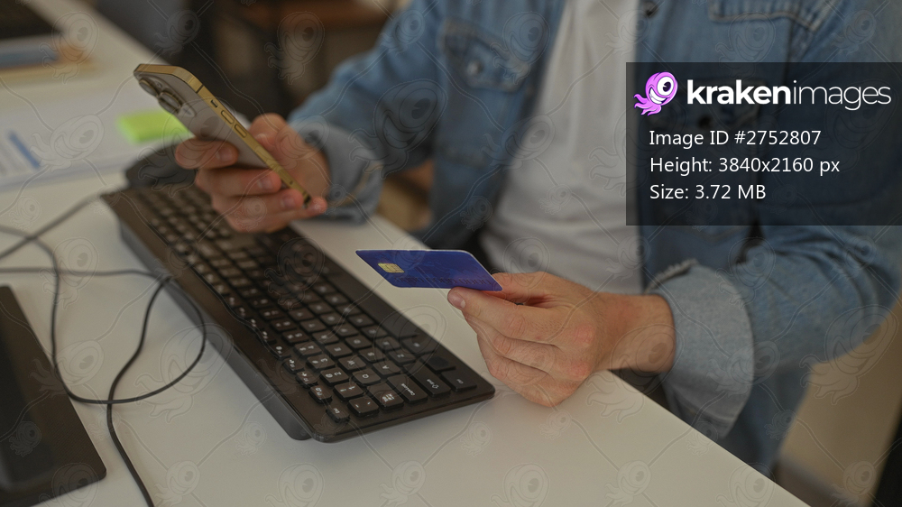 Man wearing denim holding credit card and smartphone at office desk with keyboard in modern workplace setting, indoor.