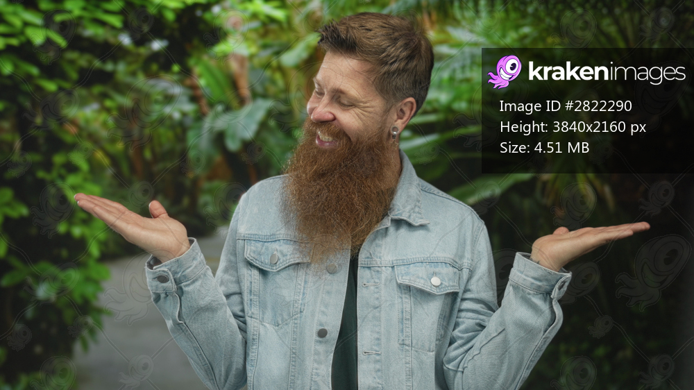 Man wearing denim jacket holds open hands out to sides amid dense foliage on forest walkway; serenity balance.