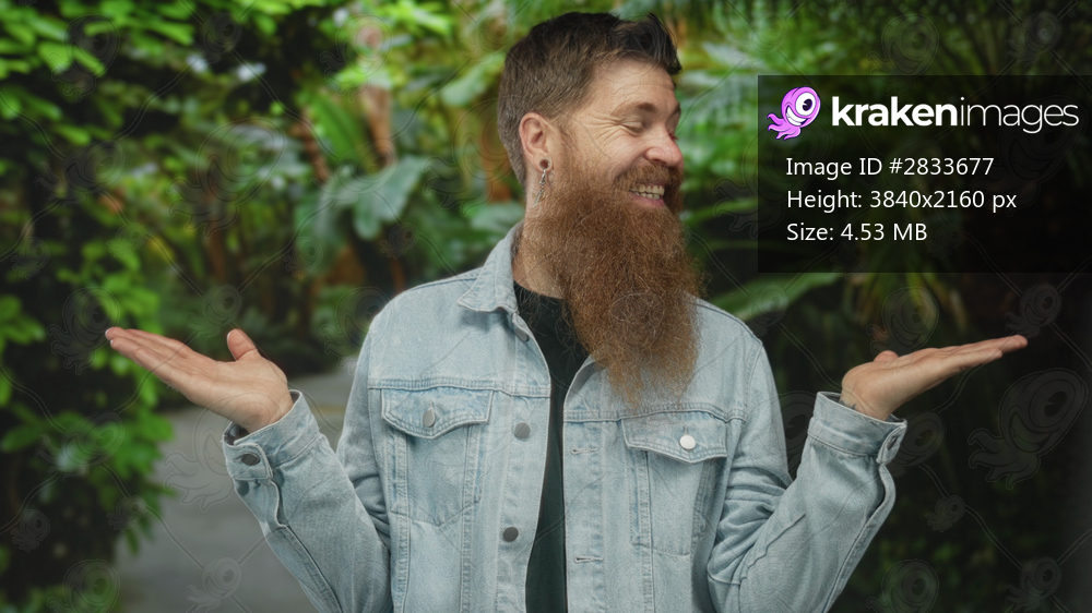Man wearing denim jacket holds open hands out to sides amid dense foliage on forest walkway; serenity balance.