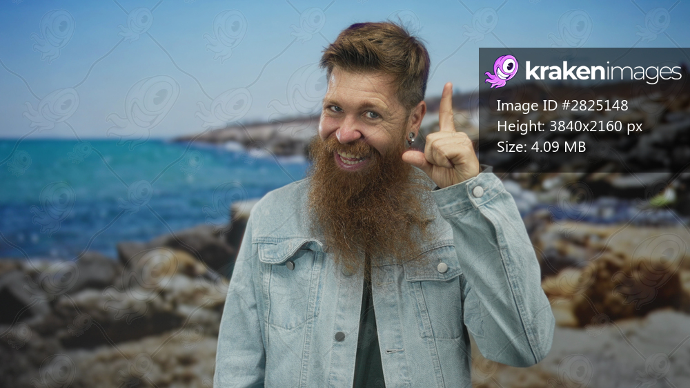 Man wearing denim jacket smiling and pointing finger skyward on a sunlit rocky beach shore by turquoise sea; optimism.