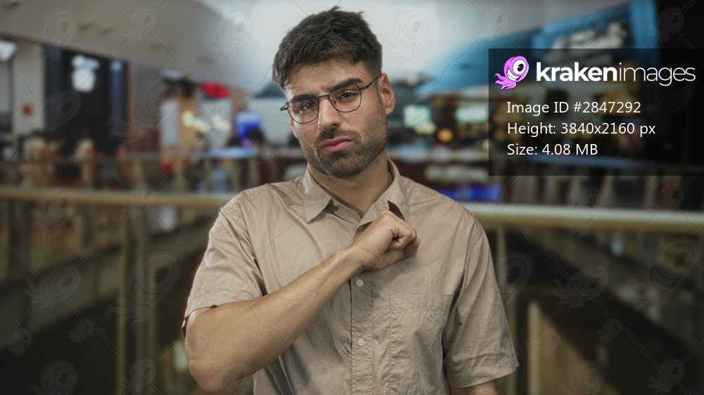 Man wearing eyeglasses holds hand in fist gesture near chest in brightly lit mall center with blurred shops behind; determination.