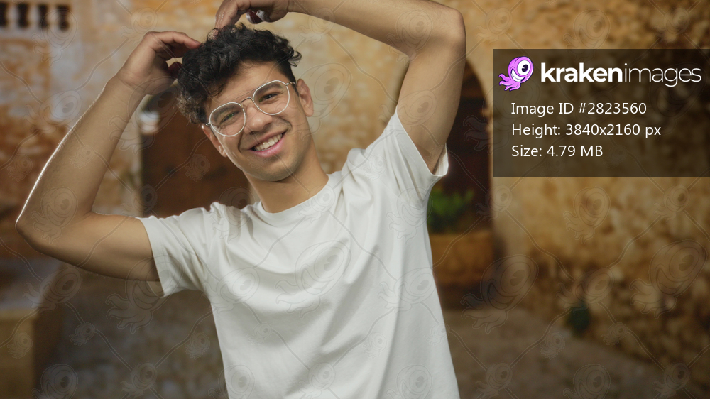 Man wearing eyeglasses lifts both arms to touch curly scalp on sunlit cobblestone street; confidence.