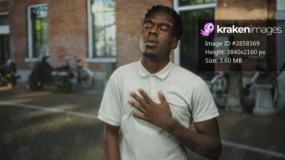 Man wearing eyeglasses and white polo clutch chest near parked bicycle on urban street under brick building facade; heartattack pain.