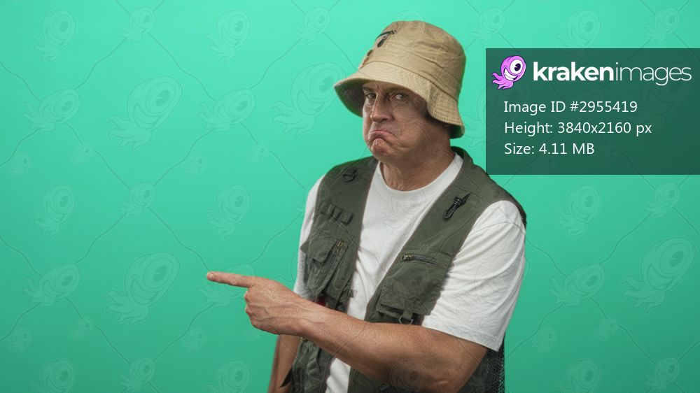 Man wearing fishing vest and bucket hat points finger to right with pout expression in studio; disapproval dry humor.