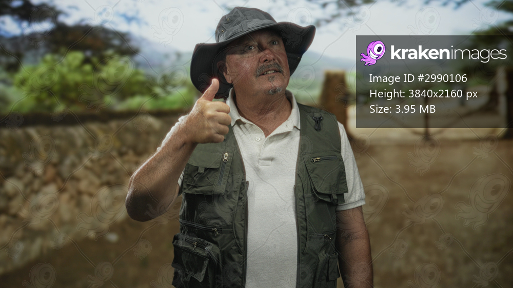 Man wearing fishing vest and wide brim hat gives thumbs up at forest gate; approval calm countryside confidence.