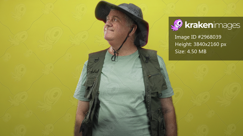 Man wearing fishing vest and wide brim hat looking upward with chin slightly raised and hands relaxed by sides in studio; contemplation.