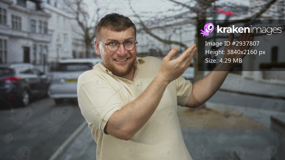 Man wearing glasses and a beige polo gesturing with both hands and open palms on a city street near parked cars and white buildings; surprise awkwardness. - Kraken Images