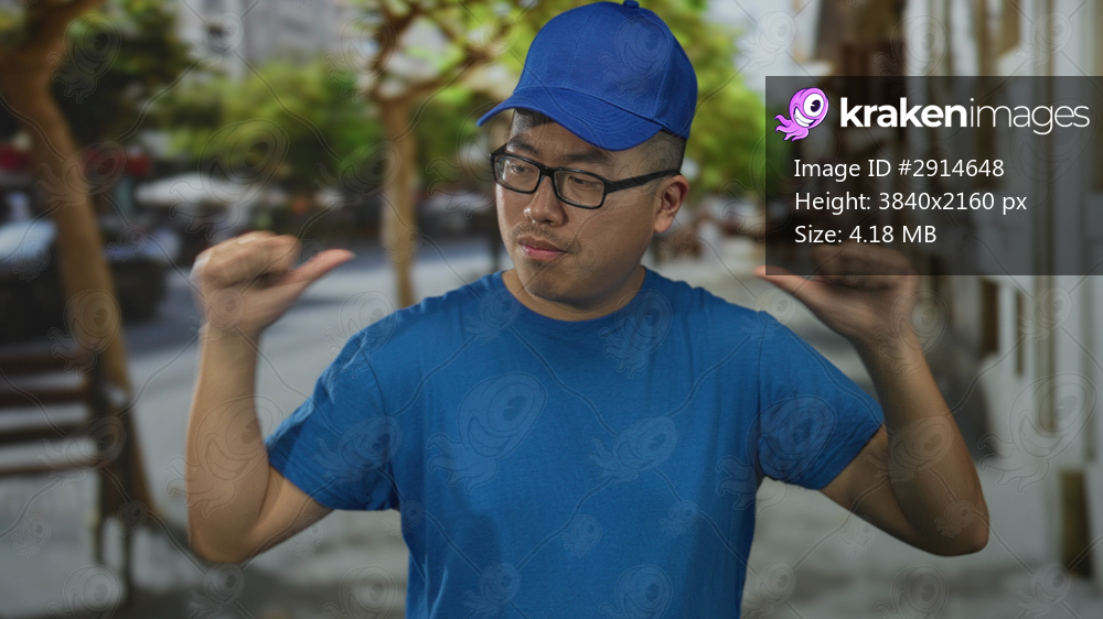 Man wearing glasses and a blue baseball cap and plain blue t shirt points both thumbs to his chest on a busy city street lined with trees and cafes; confidence. - Kraken Images