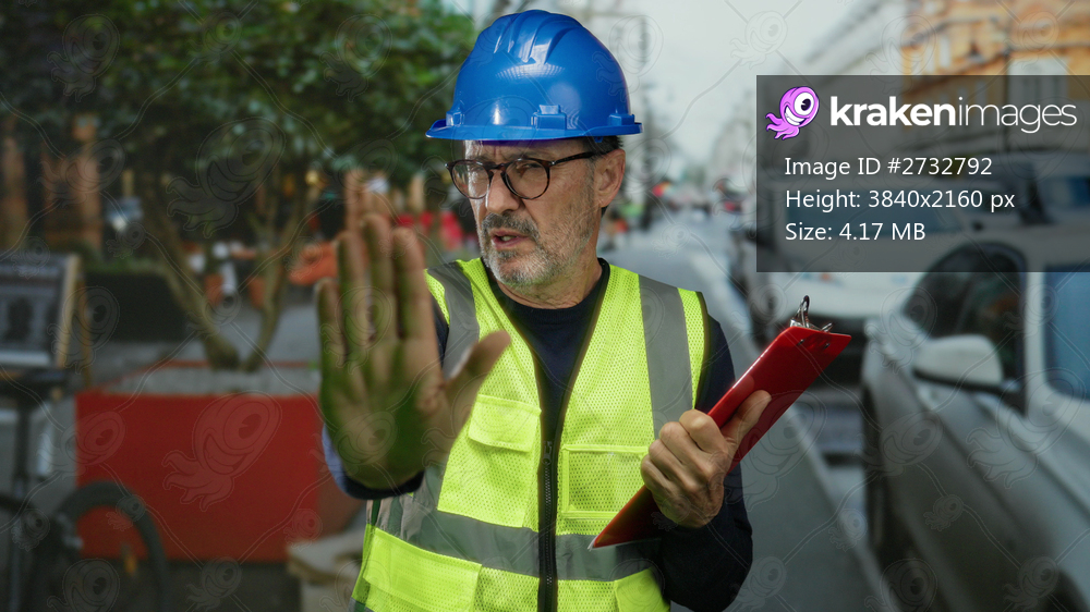 Man wearing glasses and a blue helmet holds a clipboard in a bustling urban street while gesturing to signal stop on a busy day.