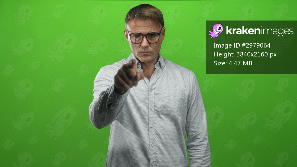 Man wearing glasses and a button shirt points finger forward with visible hand and serious gaze in a green studio; confidence authority.