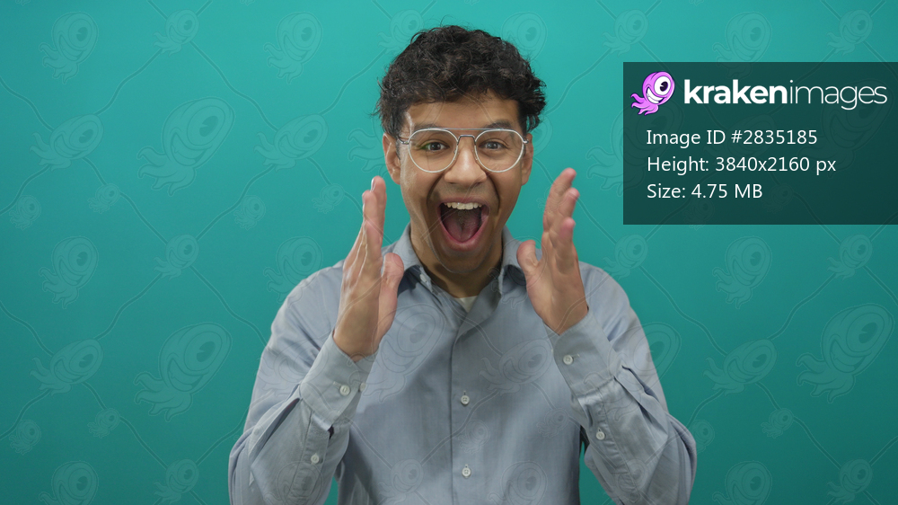 Man wearing glasses and a light shirt holds hands to face with open mouth in a teal studio; surprise.