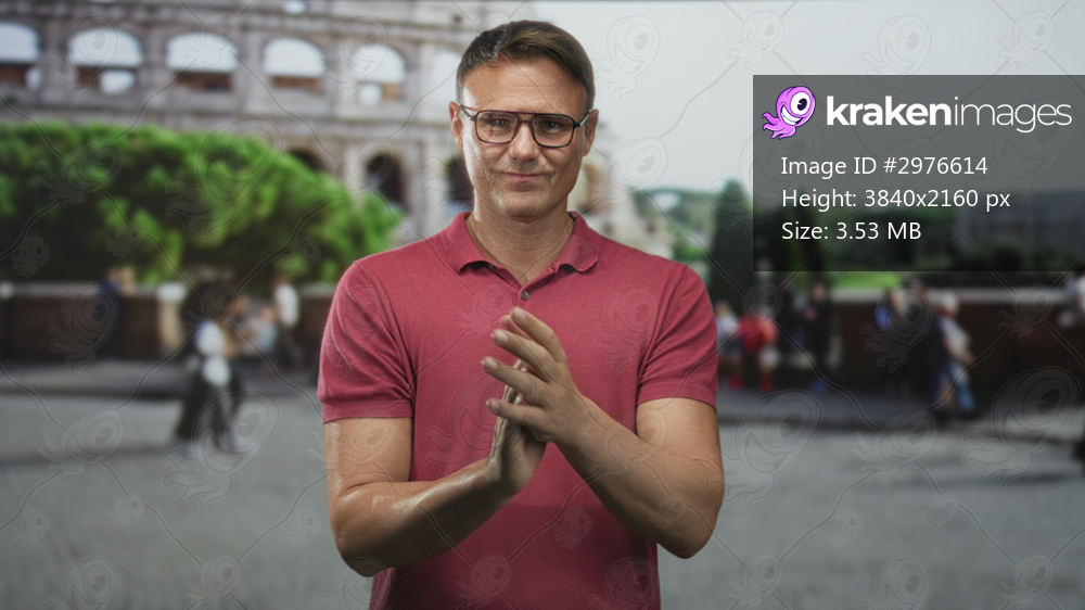 Man wearing glasses and a red polo shirt clapping hands at building colosseum on a plaza in rome, smiling at camera; appreciation travel.