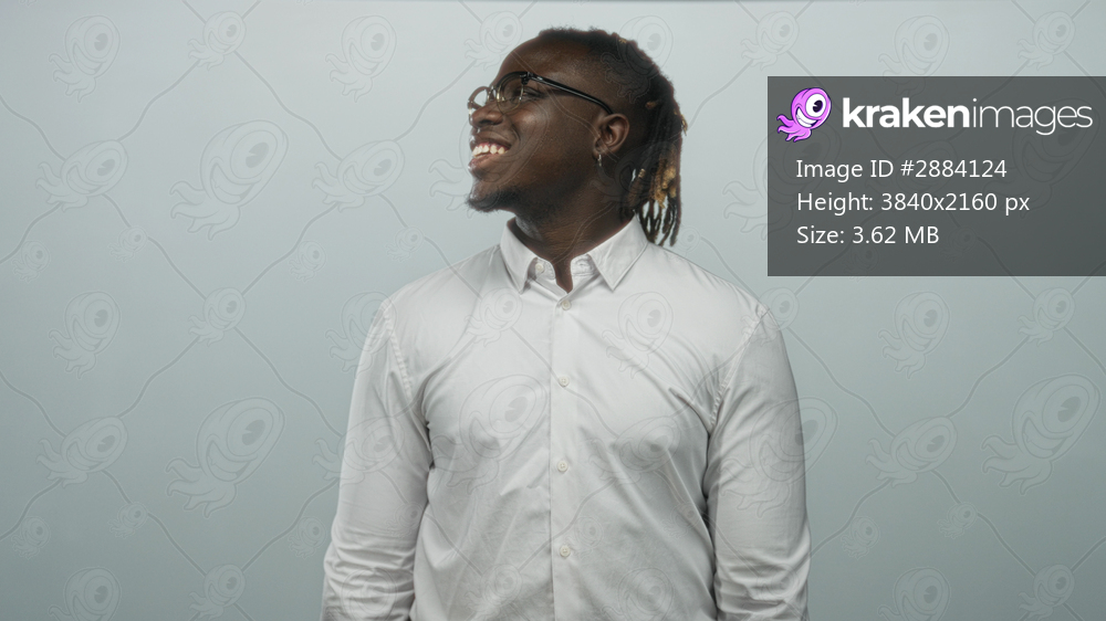 Man wearing glasses and a white shirt smiling and looking up in a light gray studio; joy optimism confidence.