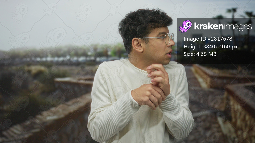 Man wearing glasses and a white sweater covers his mouth with both hands outside a building with palm trees overhead; surprise.