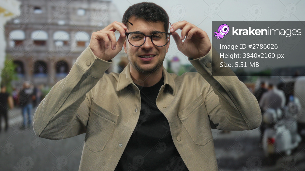 Man wearing glasses adjusts pose before colosseum to capture hispanic journey in rome as tourist selects sleek spectacles and fixes lens for confident male traveler. - Kraken Images