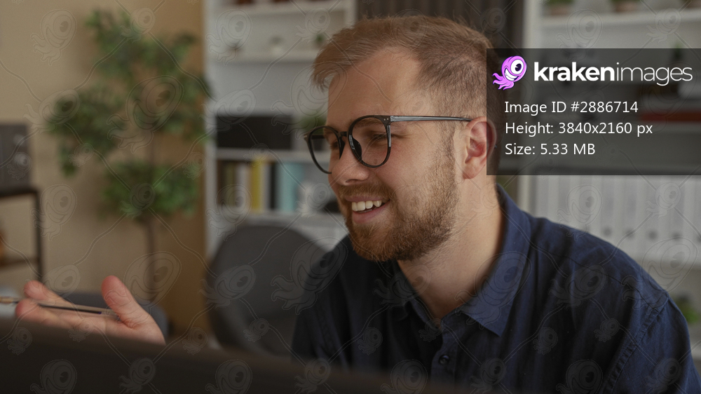 Man wearing glasses and beard holding smartphone and smiling while gesturing with hand in an office building; concentration.