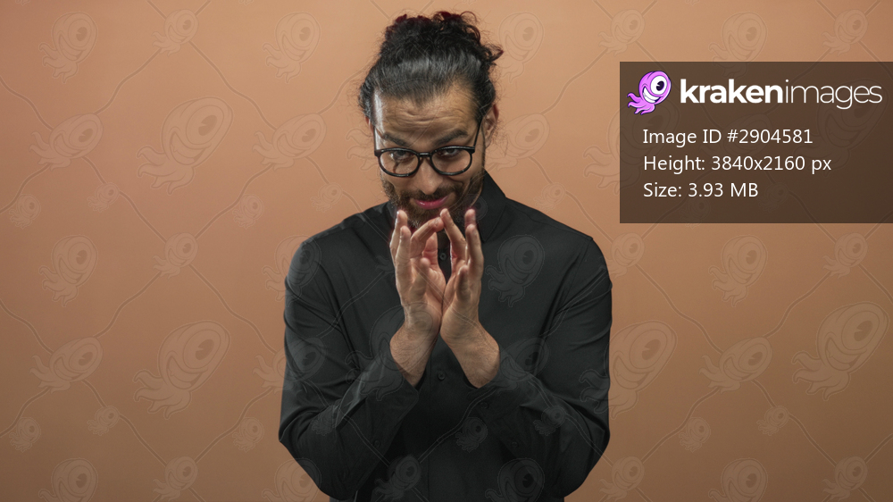 Man wearing glasses and black shirt clasping his hands together in a peach studio under soft warm lighting; scheming mischief.