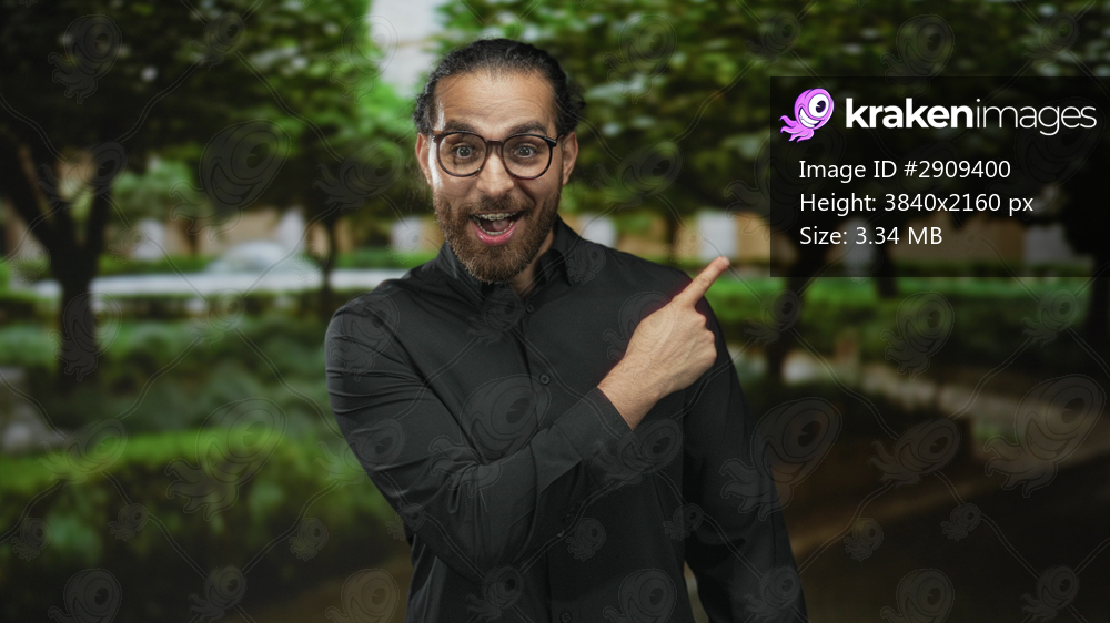 Man wearing glasses and black shirt giving thumbs up and pointing gesture in forest walkway near green park trees, smiling with beard and braces; confidence encouragement. - Kraken Images