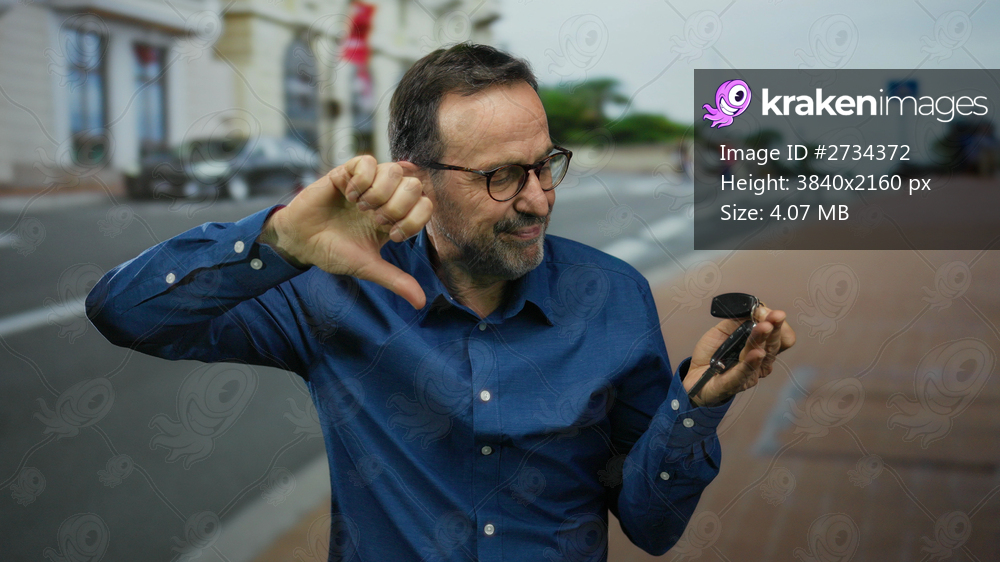 Man wearing glasses and blue shirt displays thumbs down with car keys in an urban street setting, capturing a displeased expression in the city exterior. - Kraken Images