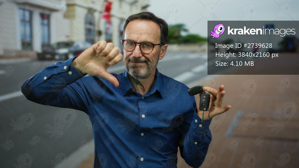 Man wearing glasses and blue shirt displays thumbs down with car keys in an urban street setting, capturing a displeased expression in the city exterior. - Kraken Images