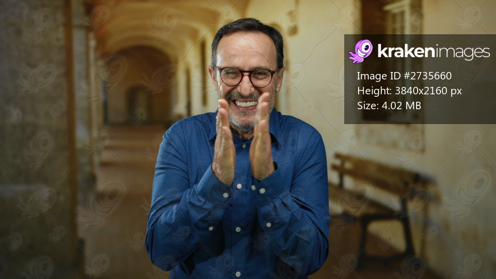 Man wearing glasses and blue shirt expressing joy in outdoor university setting with historic architecture in background.
