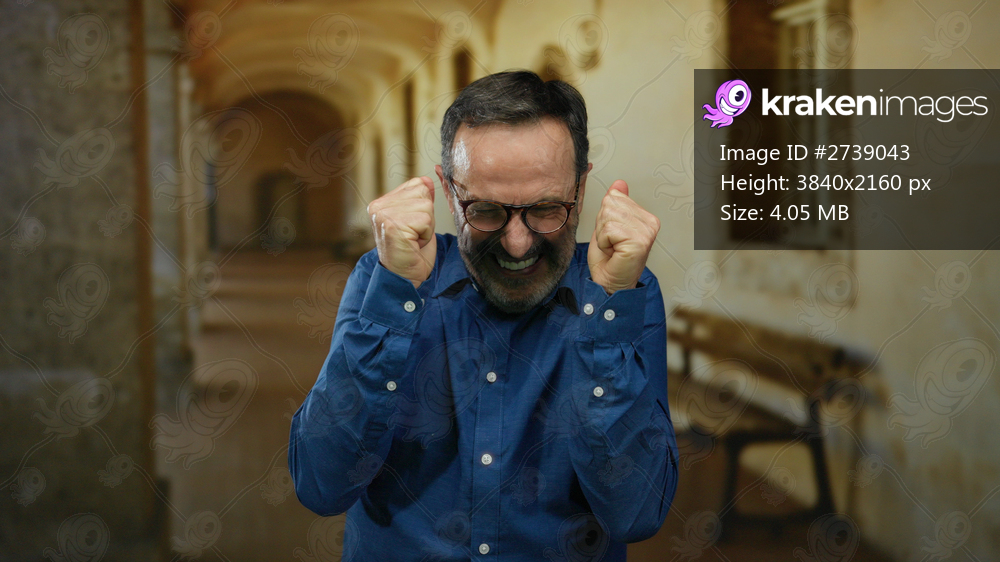 Man wearing glasses and blue shirt expressing joy in outdoor university setting with historic architecture in background.