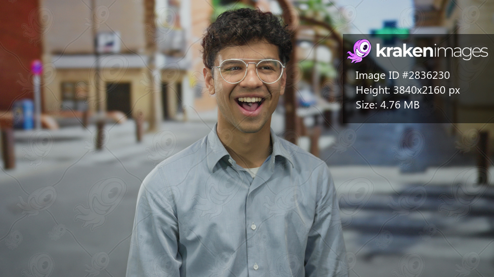 Man wearing glasses and blue shirt laughs showing white teeth on a sunlit street by a building outdoors; joy.