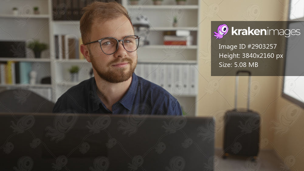 Man wearing glasses and blue shirt looking at monitor on desk in office building with suitcase and bookshelf nearby, glancing toward window; thoughtful focus. - Kraken Images