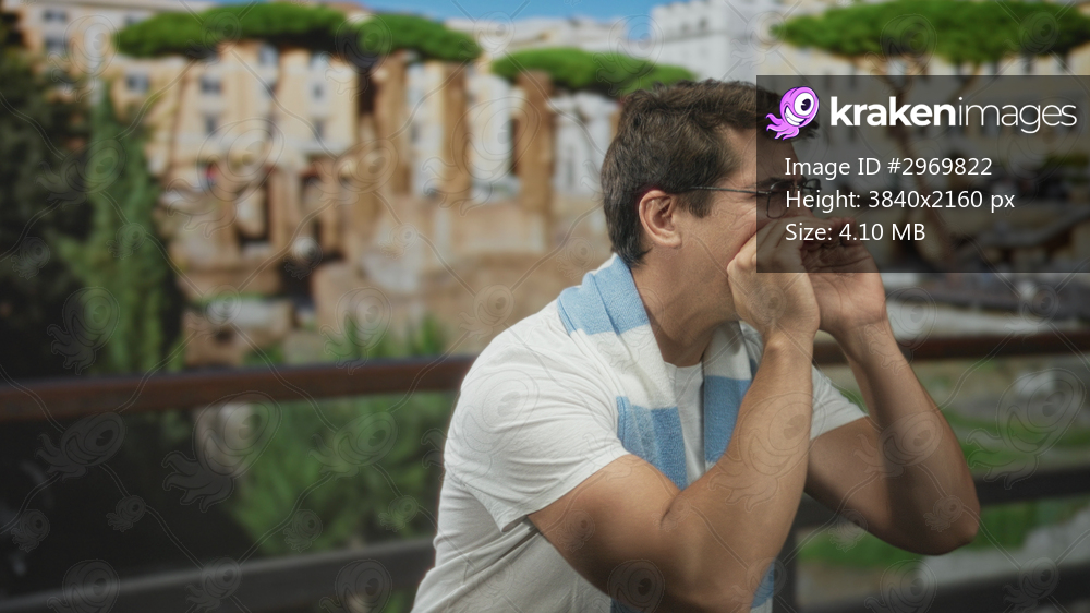 Man wearing glasses and blue and white scarf cupping hands to mouth on building railing in daylight; supportive fan energy.