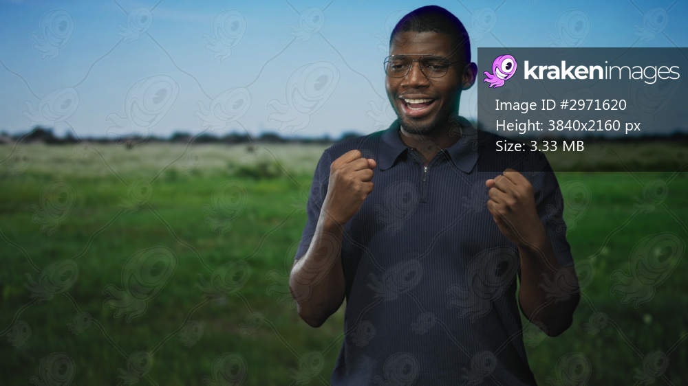 Man wearing glasses, clenched fists and broad smile in studio set resembling an open meadow, celebrating a small win; victory joy.