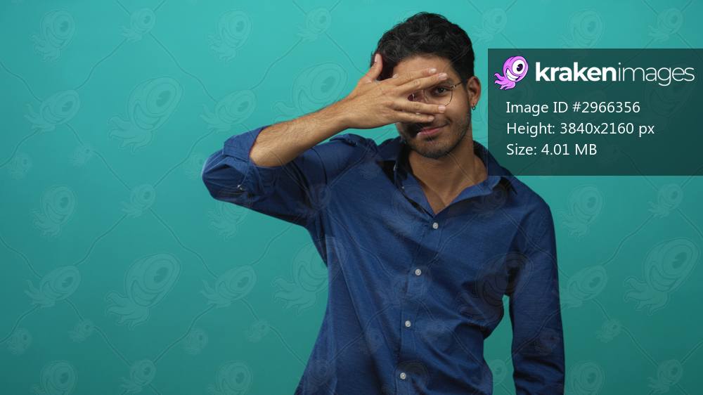 Man wearing glasses covers face with hand in studio, blue shirt visible and teal backdrop; playful confidence.
