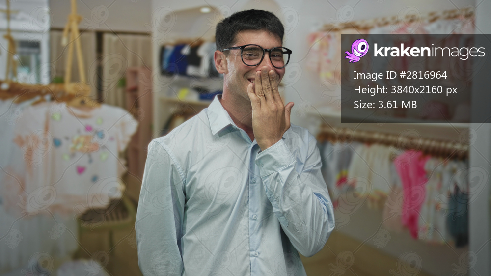 Man wearing glasses covers mouth with hand while browsing shirt rack in retail building; amusement shopping.