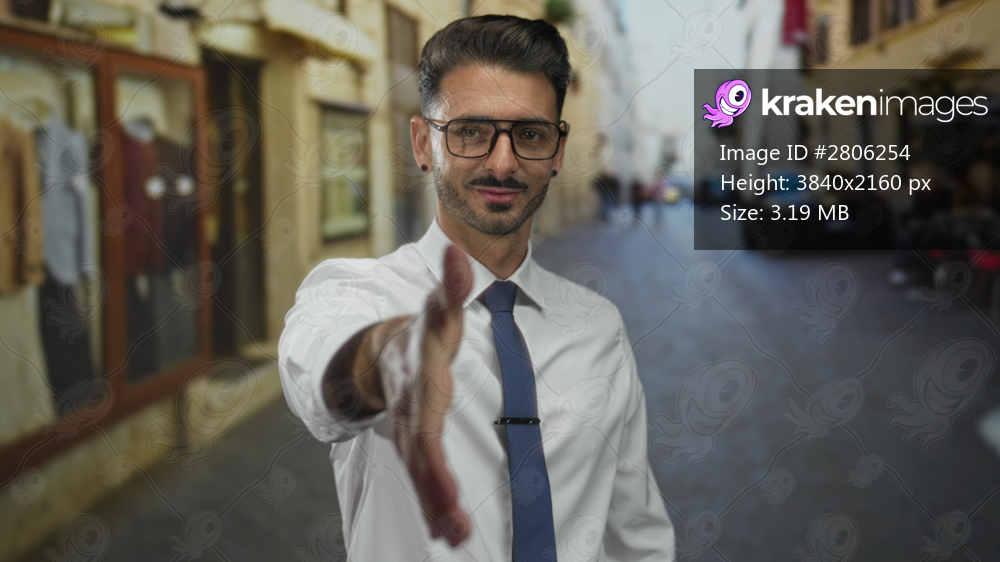 Man wearing glasses extends hand for hearty handshake on street; trust connection partnership opportunity.