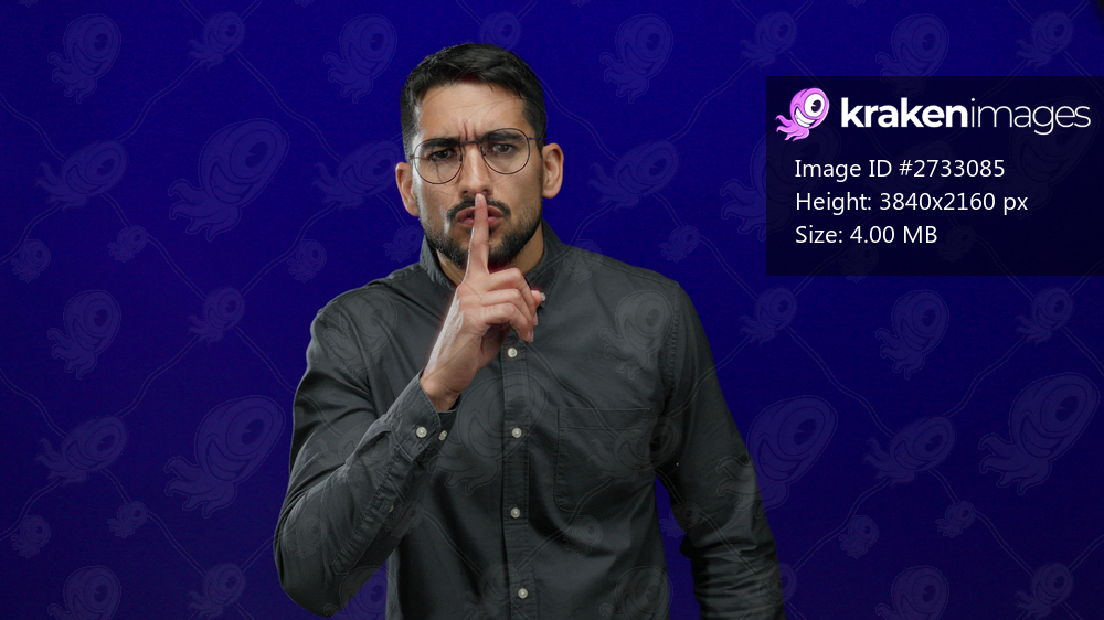 Man wearing glasses gestures quiet with finger over lips and points upward, isolated against blue background, conveying silence and attention.