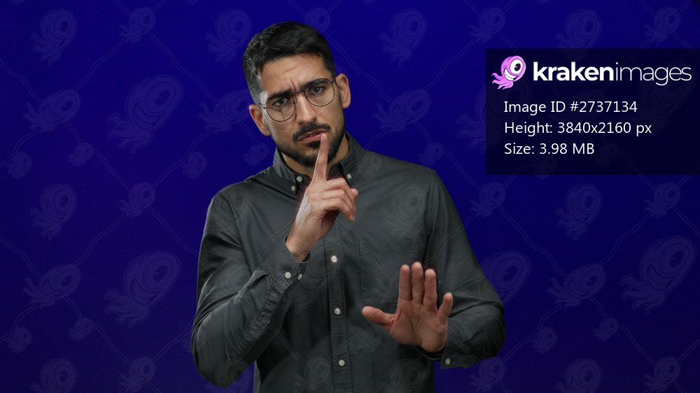 Man wearing glasses gestures quiet with finger over lips and points upward, isolated against blue background, conveying silence and attention.