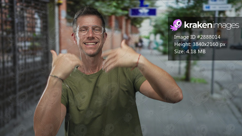 Man wearing glasses gesturing with hands and smiling on a busy city street near brick building; friendly invitation.