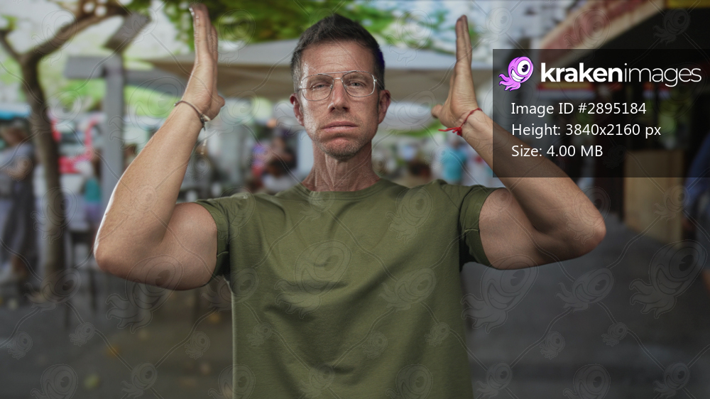 Man wearing glasses and green t shirt with hands raised near head and closed eyes at a street cafe terrace with outdoor tables and pedestrians; calm reflection. - Kraken Images
