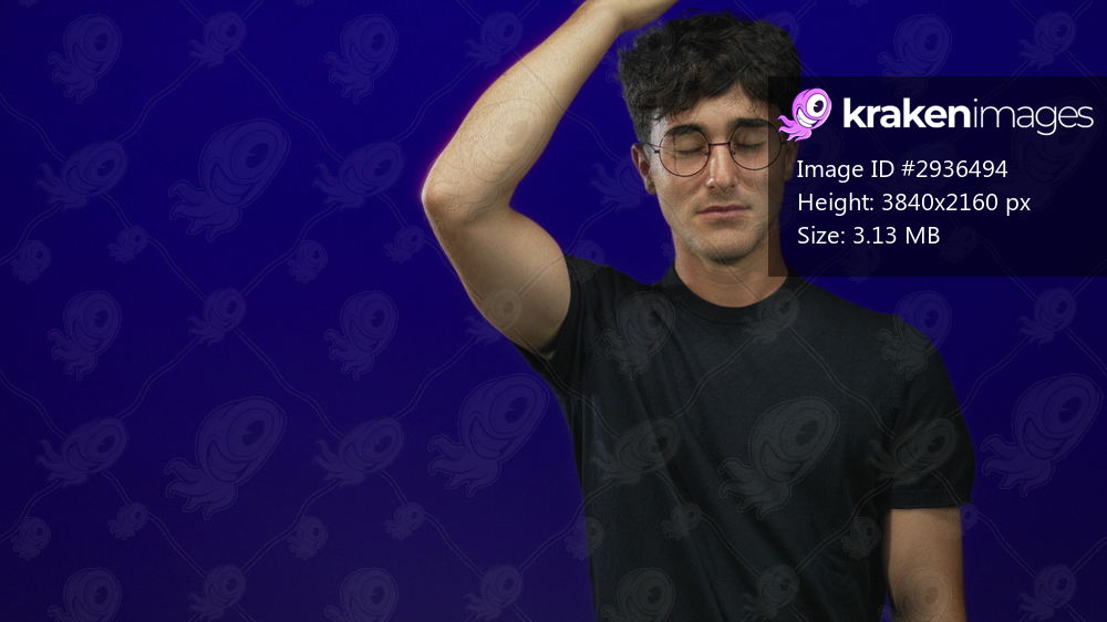 Man wearing glasses with hand on chest and palm to forehead gesture in blue studio, facing camera and smiling faintly; regret.