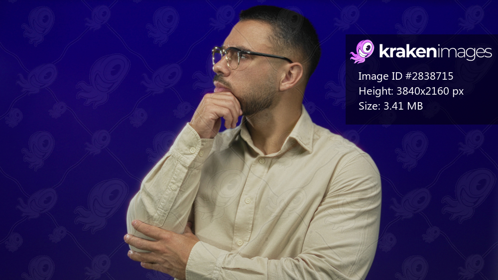 Man wearing glasses with hand on chin for thinking in a blue studio setting showing pensive posture; introspection.
