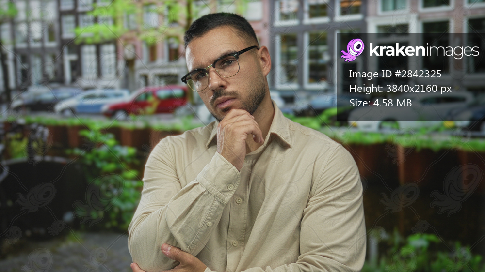 Man wearing glasses with hand on chin standing on street with building facade behind him; contemplation.