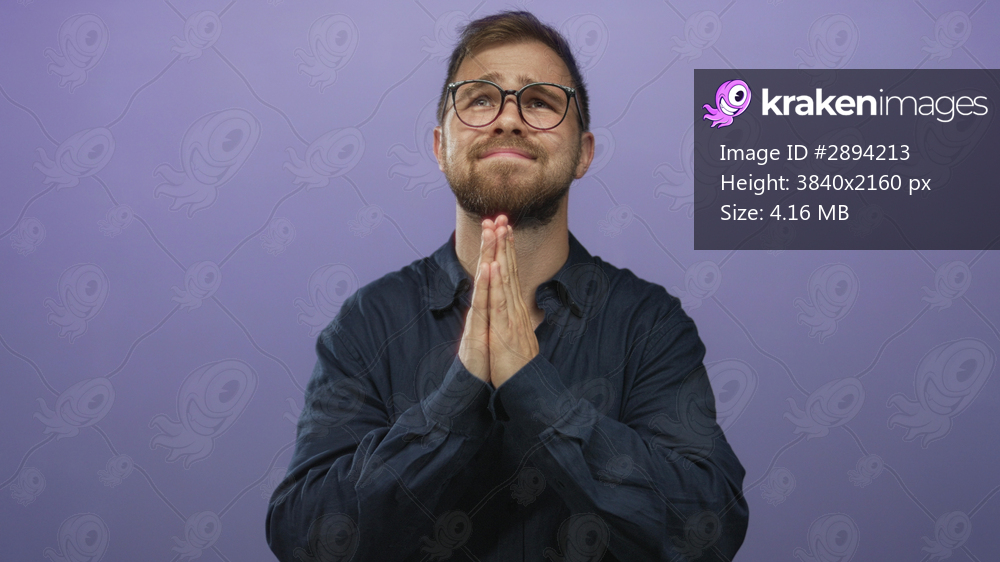 Man wearing glasses with hands pressed in prayer in purple studio looking upward; hope prayer plea sincere.