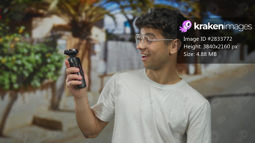 Man wearing glasses holding electric shaver examines its rotating blades at a building entrance; curiosity grooming care.